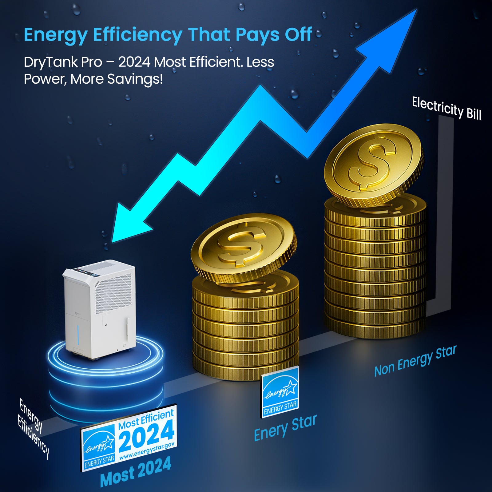 - [ 2024 Most Efficient Energy Star Dehumidifiers for Home ] Ideal for spaces over 5,000 sq. ft., the DryTank Pro removes up to 150 pints/day under extreme conditions (95℉, 95% RH), far exceeding typical 80-pint units. At standard settings (80℉, 60% RH), it delivers 80 pints/day, and still performs at 50 pints/day in cooler environments (65℉, 60% RH). Certified as a 2024 Most Efficient model, it’s a powerful, energy-saving choice for any home. Note: Capacity ≠ tank volume