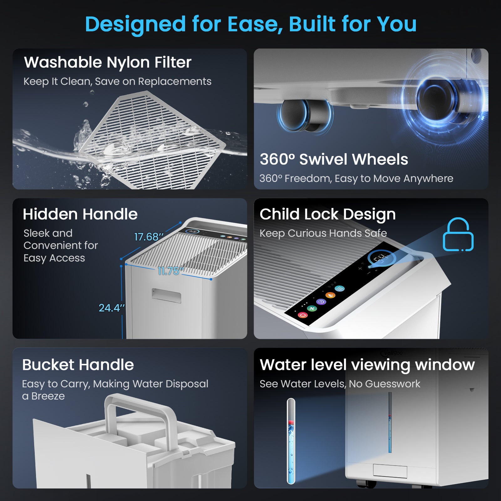 - [ Smart, Thoughtful Design—Made for Your Comfort ] Vellgoo dehumidifier offers 3 versatile modes (Continuous, Custom, Sleep) to meet all your needs. Built-in wheels and handle make it easy to move. A child lock adds safety, and the washable filter reduces maintenance. From setup to daily use, every detail is designed for comfort. Just set it—Smart Humidity Control does the rest